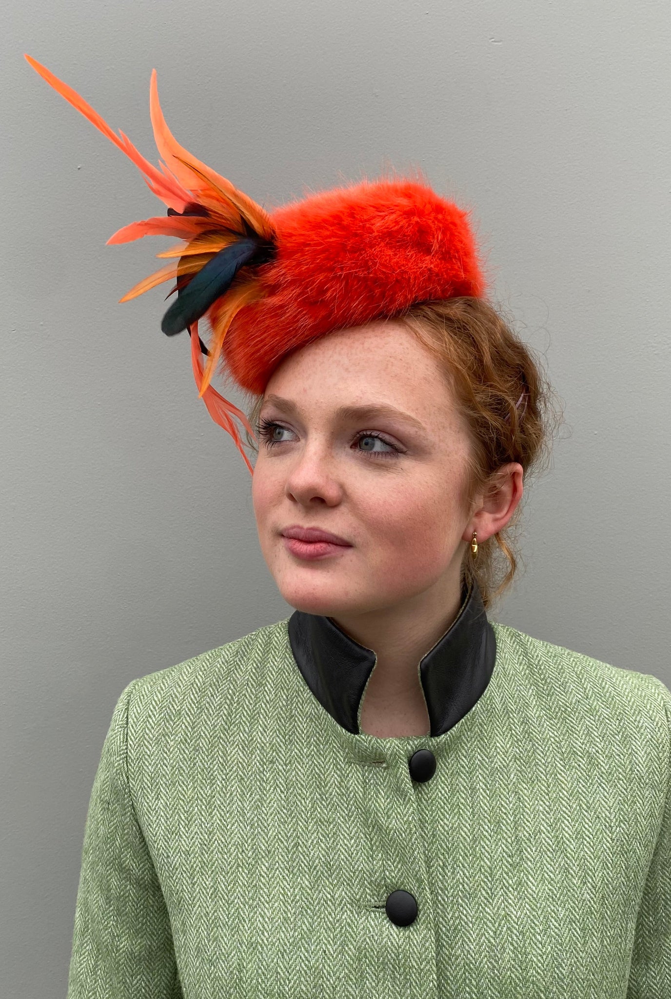 The Forence is a Hand-blocked pillbox on a sinamay base.  In a radiant orange faux fur, it is embellished with hand dyed bantam feathers.